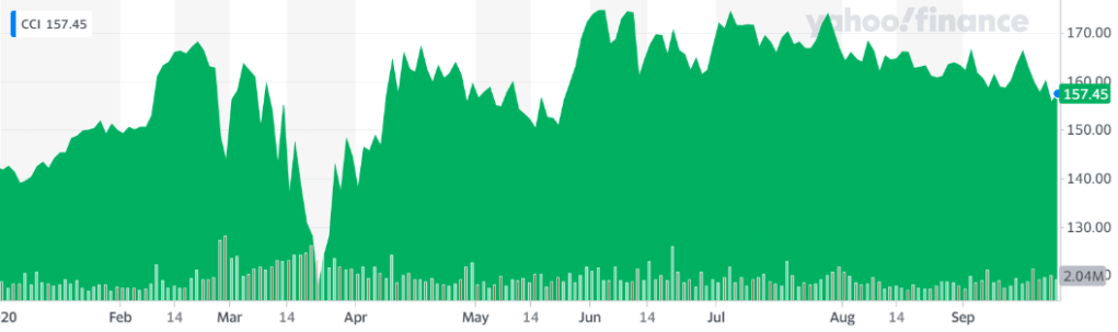 Crown Castle owns, operates and leases more than 40,000 cell towers and approximately 80,000 route miles of fiber supporting small cells and fiber solutions across every major U.S. market. This nationwide portfolio of communications infrastructure connects cities and communities to essential data, technology and wireless service. Crown Castle offering around IoT[13] backs the company being selected as unfinished-products. Crown Castle performance are similar to its competitor Tower America and its 52-week-change index is also in the one digit (9.59%).