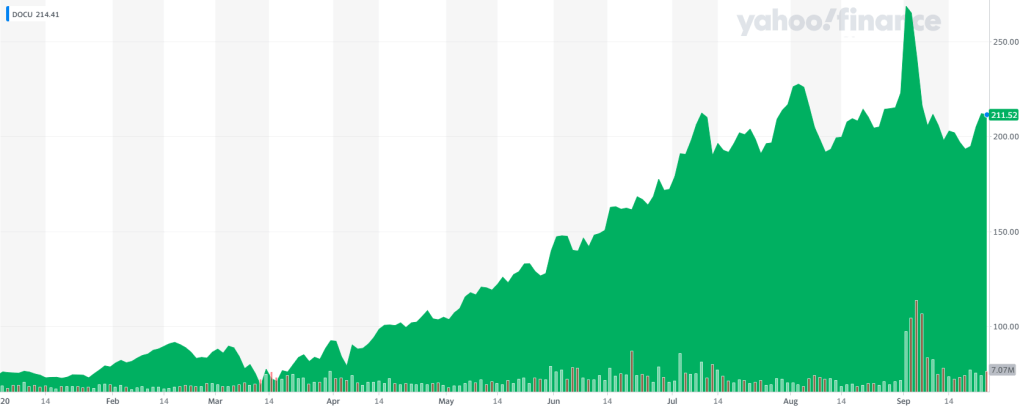 DocuSign is the second best performer in the technology industry just after Zoom Video. The video conference platform, connecting people working / studying / socializing from home during the pandemic, increased by 255% its market capitalization.