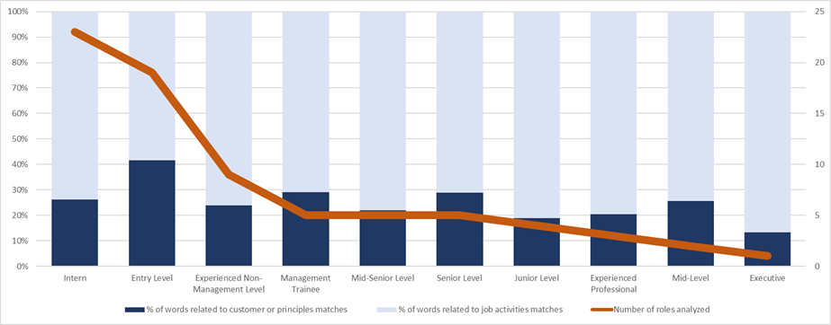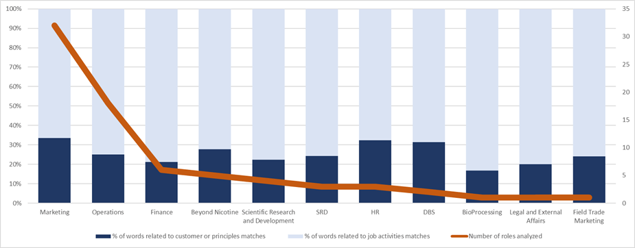 Looking at the internal marketing, in addition to public available data, the article analyses BAT’s culture by examining how the company articulates job descriptions. As visualized in Figure 1 and Figure 2 below, the article evaluates the ratio between words linked to BAT evolved strategy and those defining the job activities published by BAT in U.S.. Given an average ratio of 0.29, the article asserts BAT searches for talents able to contribute to its purpose.